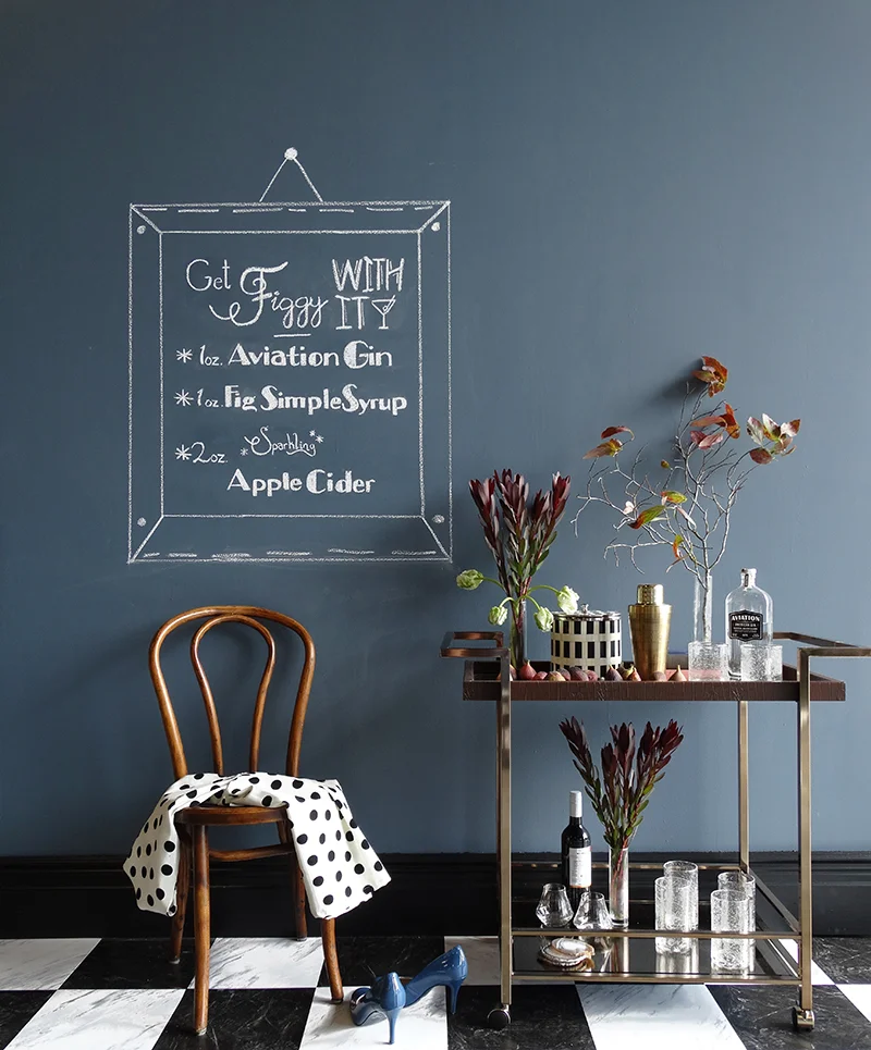 REVIVE: Bring the party inside during chilly months! Set a playful yet swanky mood for your cocktail party with walls painted in Chalkboard WOOL .06. Keep it old school with hand-written seasonal drink recipes and sprinkle in some luxe with metallic touches. Cheers!